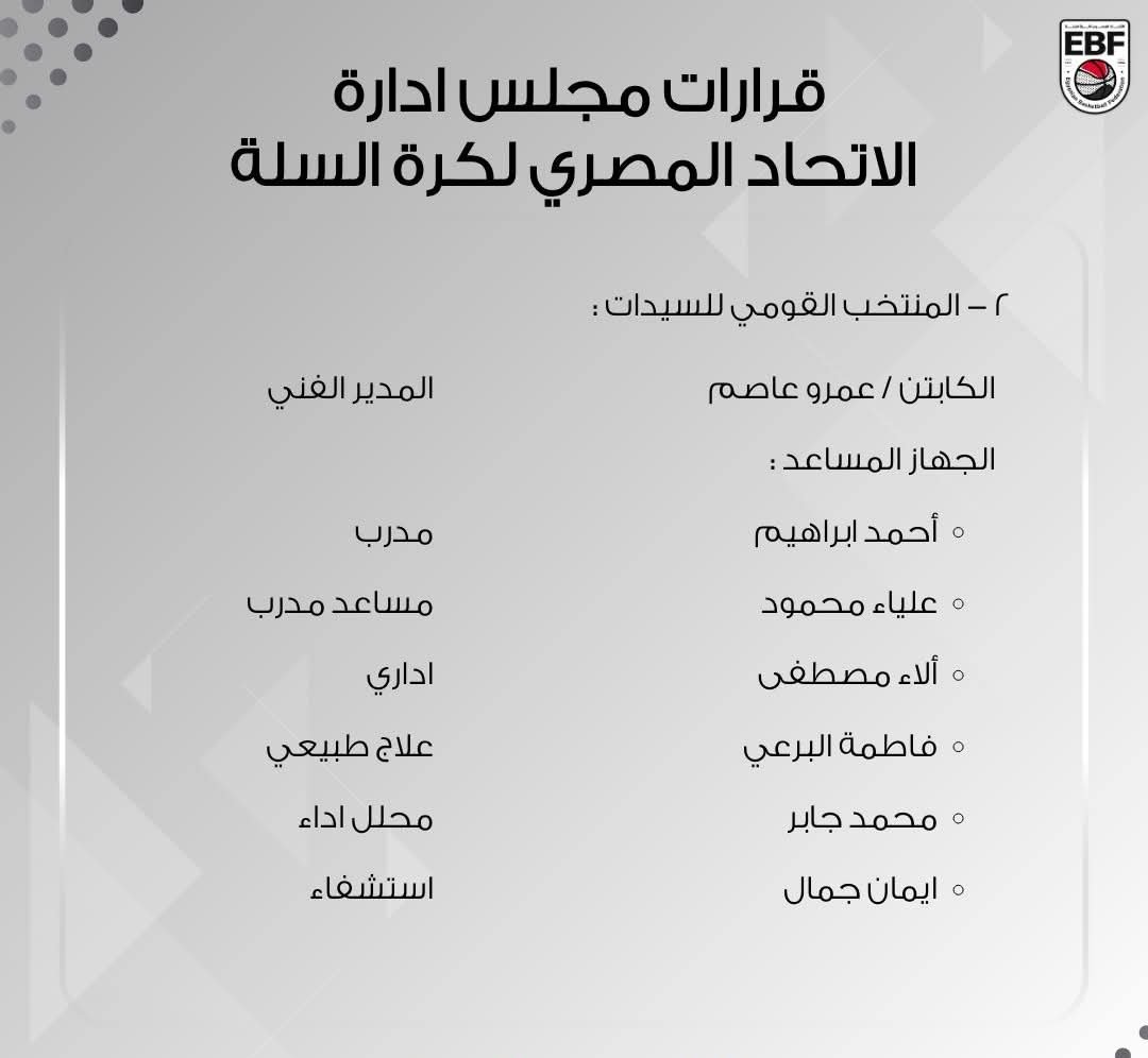 وجاءت القرارات بتعيين الكابتن عمرو عاصم مديرًا فنيًا للمنتخب، على أن يعاونه أحمد إبراهيم كمدرب عام، علياء محمود كمساعد مدرب.